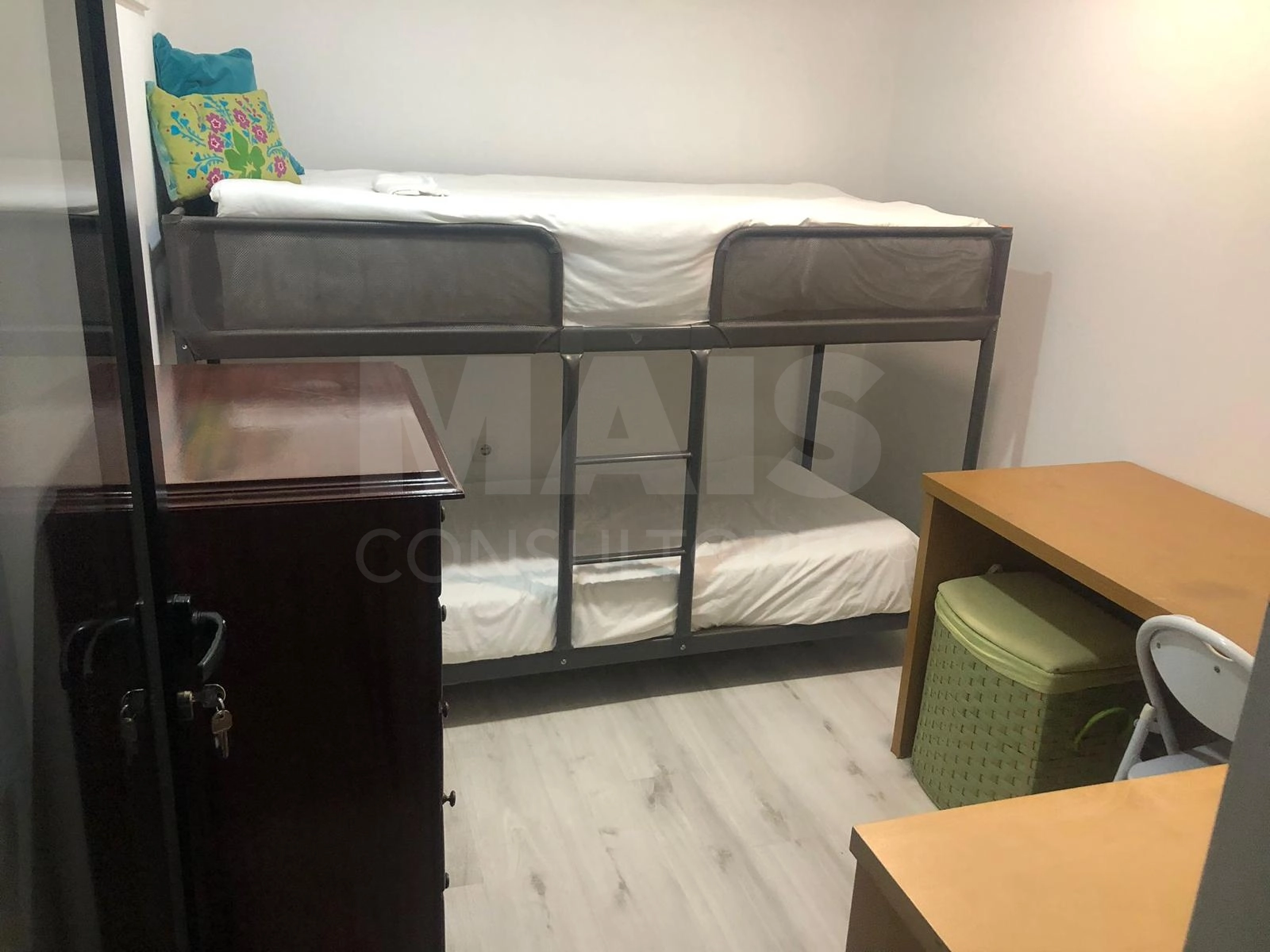 Quartos de uso privativo, para duas pessoas partilhado . Composto por cama de casal, mesa de cabeceira, roupeiro, cómoda, mesa de refeições, cadeiras, microondas, frigorifico, decoração, cesto da roupa e roupas de cama.
